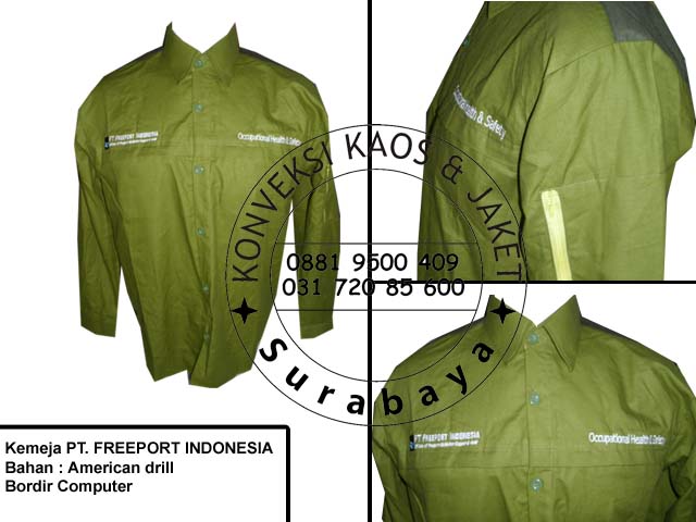Untuk gambar dari Supplier Kemeja Kantor di Surabaya merupakan hasil produksi kemeja kami dalam pembuatan kemeja untuk seragam karyawan pada salah satu perusahaan ternama di surabaya yaitu PT. FREEPORT INDONESIA. Dengan pemilihan kemeja kain american drill, yaitu kain yang terbuat dari campuran polyester dan cotton, dimana kualitas kain yang ringan juga cocok untuk kemeja staff di kantor. Yang memang berada dilokasi ber-AC. Selain itu tekstur kainnya lembut dan ringan dipakai untuk karyawan.
